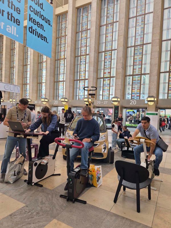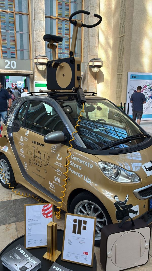 One of the most beautiful things about IFA was the people. We met kids, students, families, journalists, and even tech CEOs — all pedaling and smiling. Our gold Smart car with the HR Bank mounted on top became a social media star. People stopped for selfies, journalists filmed interviews, and even charged their phones while pedaling. It was proof that sustainable energy can also be fun, social, and beautiful.